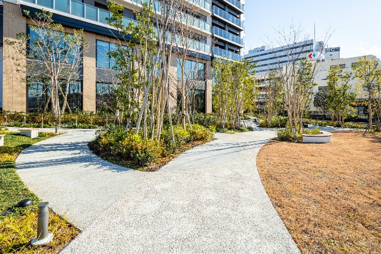 敷地内には桜などの多種多様な樹木を配し、四季の移ろいを美しく演出しています。どこを歩いても緑を感じることができる、憩いの空間が創り出されています。