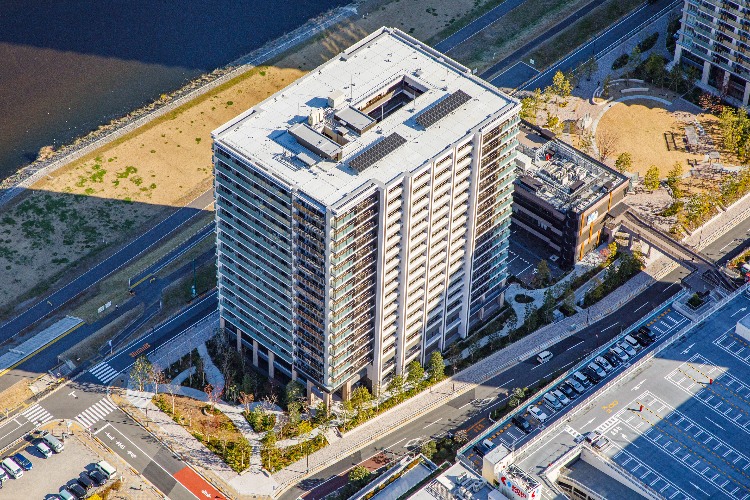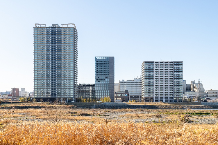 『ブリリア聖蹟桜ヶ丘ブルーミングテラス』は縦のラインを強調したファサードで、大樹が集まり空に伸びる“BUNDLE”をコンセプトにデザインされています。多摩川の潤いと一体となるような美しい街並みを目指し、街区全体では「RIVER SIDE TERRACE」というコンセプトが掲げられています。