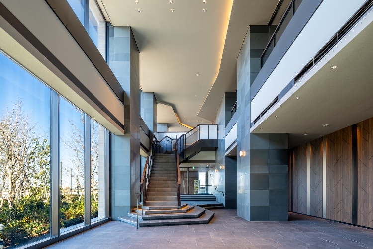 二層吹き抜けの開放感あふれるグランドエントランスが、住まう人を気持ちよく迎えます。ガラス越しに映る豊かな植栽のランドスケープが季節感を演出します。
