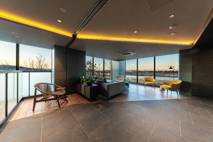 2階のエントランスラウンジでは、目の前に広がる多摩川の豊かな自然を眺めながら、穏やかなひとときを過ごすことができます。日々の喧騒から解き放たれ、水辺の安らぎを感じられる寛ぎのラウンジ空間です。
