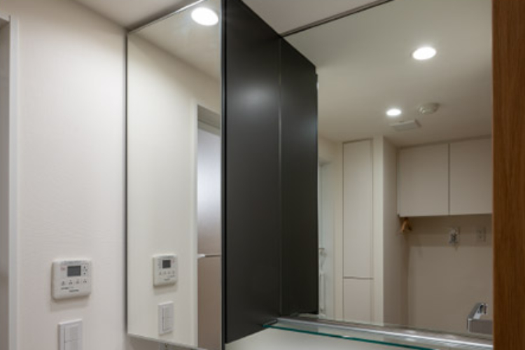 鏡の裏側を活用し、洗面小物や化粧品等を置ける収納を確保しています。
