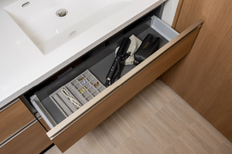 収納は、引き出しを閉める際の衝撃を最小限に抑えるソフトクローズ機能付きです。静かでスムーズに開閉できる優しい仕様です。