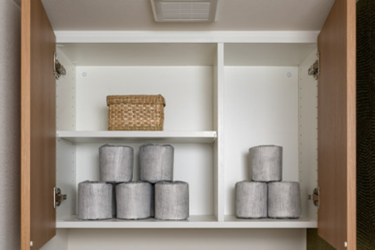 トイレットペーパーやサニタリー用品、お掃除グッズ等をまとめて収納できる便利な吊戸棚が設置されています。