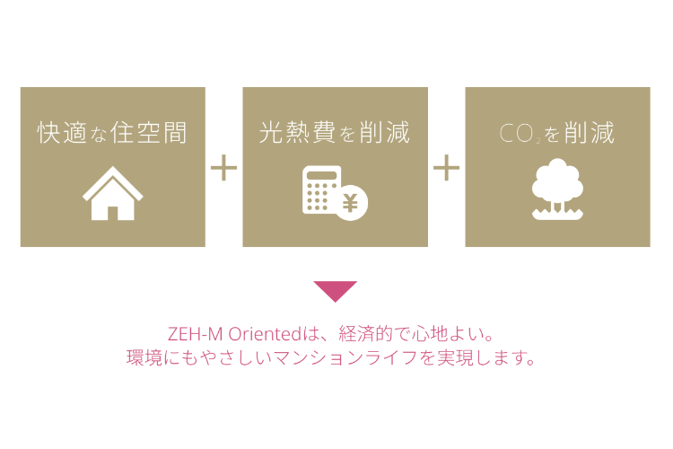 ZEH-M Oriented<ゼッチ・マンション・オリエンテッド>とは、断熱性能の向上、効率的な設備等の導入により、大幅な省エネを実現し、共用部を含むマンション全体での一次エネルギー消費量を20%以上削減したマンションです。